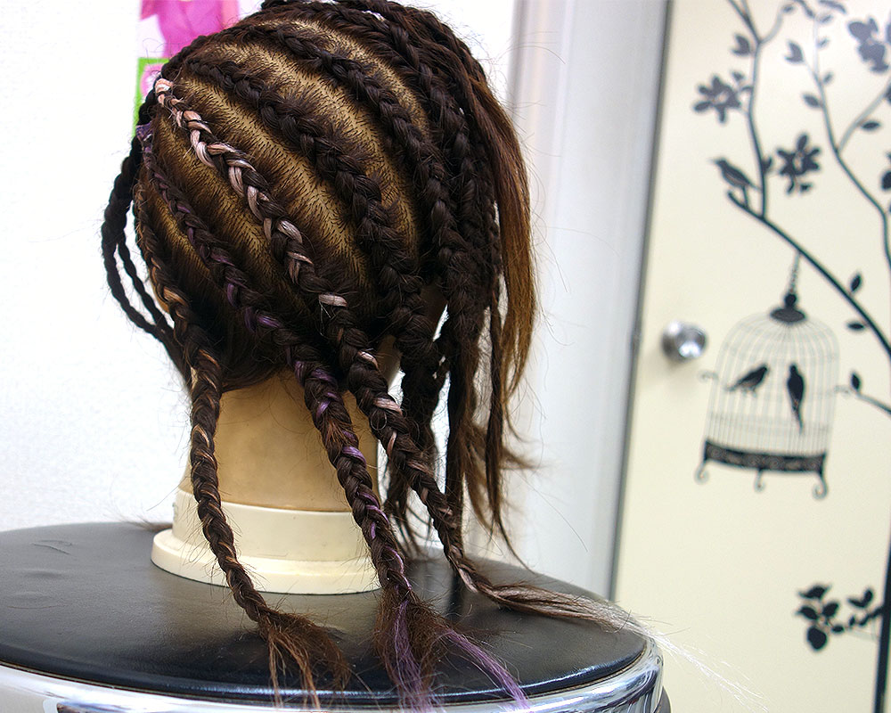 これは編み込みに「オレンジ」「パープル」「ピンク」の三色を使ってみました。
